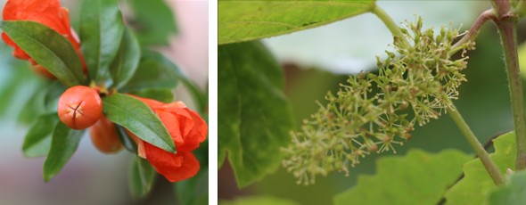 走近來看看,會讓你感覺不一樣喲!首先是遠(yuǎn)景的石榴,紅紅的石榴后面,是生長在西餐廳邊上的葡萄,嘻嘻,知道葡萄下面的兩棵是什么嗎?想一想,猜中后有獎喲!