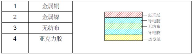 柔性電路板的材料之一導(dǎo)電布是由金屬、導(dǎo)電膠、無紡布和兩層離型紙組成,在使用時一層離型紙在貼到FPC前去除,另一層離型紙客戶端組裝時去除,實際使用的為中間的導(dǎo)電部分,下為導(dǎo)電布結(jié)構(gòu)示意圖。