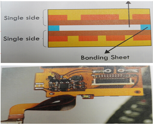 當(dāng)單面軟板無法負(fù)擔(dān)連接密度時就必須增加導(dǎo)電層,高分子厚膜技術(shù)也可以用在此類產(chǎn)品,只是印刷必須分面制作。雙面線路設(shè)計會充分利用各單面繞線面積,靠選擇性互連滿足更復(fù)雜的連接需求。許多不同的雙面間連接,都可以連成面間連通。典型雙面軟板結(jié)構(gòu)如圖所示: