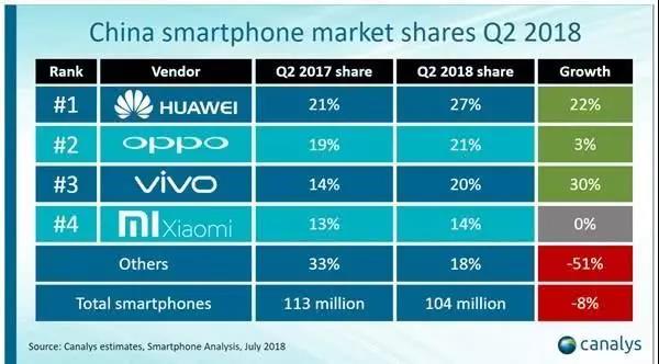不出所料,排名第二的是OPPO,OPPO第二季度的市場(chǎng)份額與第一季度相比較基本保持穩(wěn)定,增幅為3%。緊接著,vivo位列第三。但是,vivo的增幅甚至超過(guò)了華為手機(jī),增長(zhǎng)了30%。從圖表中可以看出,vivo與OPPO所占市場(chǎng)份額的差距僅有1%。近幾年來(lái),OPPO與vivo的發(fā)展速度也可謂是非常之快。
