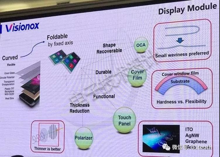 如對偏光片的要求越來越薄、希望觸控屏幕做到可折迭、蓋板需要兼顧表面硬度和可彎折性,以及各個(gè)功能之間的連接材料如OCA膠水,也對軟性AMOLED帶來新的挑戰(zhàn)。