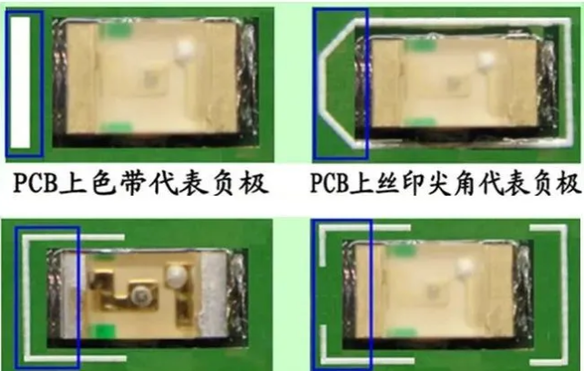 PCB負(fù)極標(biāo)示:1) 豎杠代表;2) 色帶代表;3) 絲印尖角代表;4) 絲印“匚”框代表。