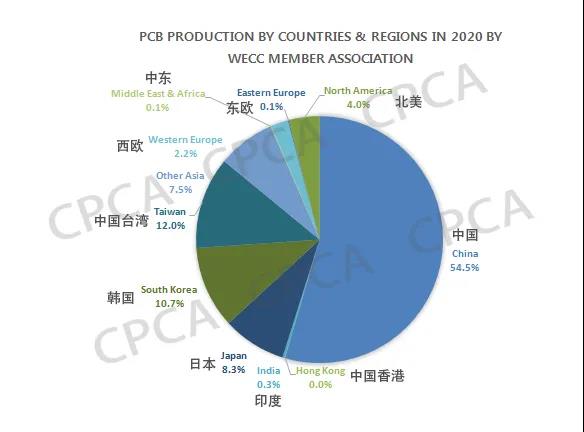 圖1 2020年wecc成員協(xié)會(huì)按國(guó)家和地區(qū)劃分的PCB生產(chǎn)總值占比