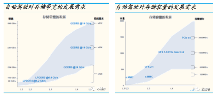 隨著自動駕駛級別的提升,對汽車芯片算力和存儲能力的需求不斷攀升。前瞻產(chǎn)業(yè)研究院數(shù)據(jù)顯示,目前一輛高端汽車的自動駕駛系統(tǒng)代碼超 1 億行,自動駕駛軟件計算量達到每秒 10 萬億次操作的量級,遠超飛機、手機、互聯(lián)網(wǎng)軟件等。隨著未來自動駕駛滲透率與級別的提升,汽車系統(tǒng)代碼行數(shù)將會呈現(xiàn)指數(shù)級增長,需要高帶寬的DRAM進行讀寫,DRAM會從DDR32/4GB 向LPDDR48GB 靠攏。汽車自動化過程中,用于收集車輛運行和周邊情況數(shù)據(jù)的各種傳感器會逐步增多,時刻需要收集車輛外部環(huán)境數(shù)據(jù),勢必產(chǎn)生大量的數(shù)據(jù)處理和存儲需求。除了汽車行駛本身產(chǎn)生數(shù)據(jù),汽車與汽車之間的實時信息分享、互動通信、數(shù)據(jù)交換等,也將產(chǎn)生巨大的存儲需求。