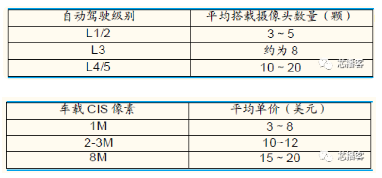 軟板廠了解到,自動駕駛級別的提升,驅(qū)動汽車CIS 量價齊升。量的方面,自動駕駛可分為L0-L5 級別,隨著級別的提升車載ADAS 系統(tǒng)搭載攝像頭數(shù)量增加,L1級別1 顆,L2 級別攝像頭搭載量在5-8 顆,L3 級別在8 顆以上,L4/L5 階段預(yù)計需要10-15 顆。價格方面,從L0-L5,對車載攝像頭像素和抗干擾性等要求不斷提升,需要在車輛高速運動中捕捉清晰物體影像,對于技術(shù)不斷迭代的需求,推升了汽車CIS 的價值量。一般L1 級別自動駕駛汽車搭載1 個后視攝像頭通常所需CIS 像素在2M 以下,3~8 美元/顆,L2/L3在2~3M、L4/L5 在3~8M,單價為10~20 美元。