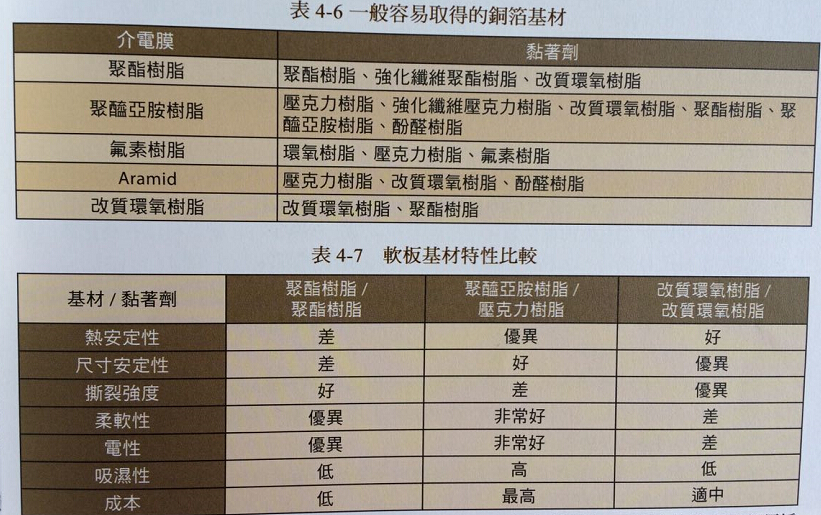 一般基材與導(dǎo)體間的結(jié)合力要求為4LBS/IN,如果基材特性可以耐熱維持這種結(jié)合力是可能的,對于無膠軟板基材而言這個(gè)特性顯得特別重要。一些基材的特性比較,如表4-6及表4-7所示,主要是針對一些黏著劑及基材應(yīng)用特性作討論。