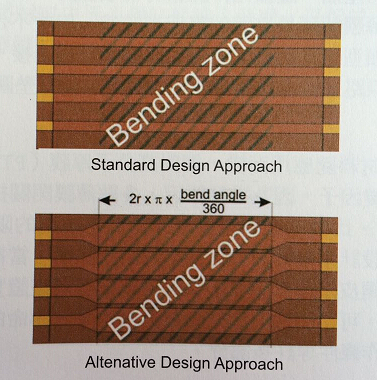 一般的潛在問題是,彎折區(qū)究竟需要多少長度,線路又要加寬多少長度呢?比較簡單的方法是,推算彎折區(qū)的橫跨角度,之后以彎折的半徑來換算彎折部分需要的概略長度,設(shè)計只要將這個長度略加多一點就可以了,應(yīng)該要確認(rèn)彎折區(qū)要足夠數(shù)量的加寬銅線路。