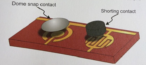 圖8-32基本的薄膜開關(guān)接觸設(shè)計,典型采用的是凸塊薄膜與短路接觸式按鍵結(jié)構(gòu)