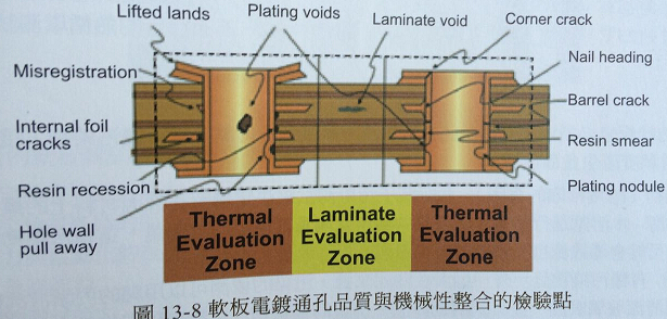 熱應(yīng)力—漂錫熱應(yīng)力測試,被用來判定是否電鍍通孔可以成功的通過組裝存活,測試是以軟板暴露到融爐焊錫10秒溫度在288℃,這比一般的典型組裝要嚴苛,但是它被用來篩選產(chǎn)品與避免臨界的產(chǎn)品進入制造。樣本被固定并進行斷面評估,如圖13-8所示。
