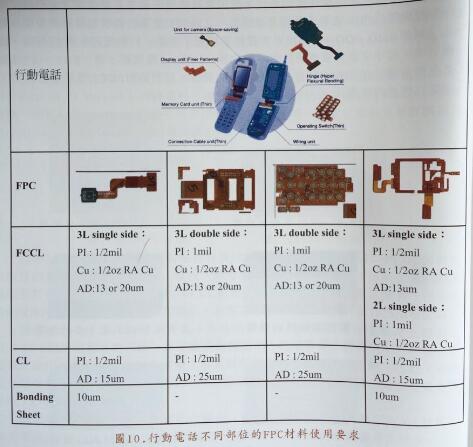 可撓曲特性雖是FPC軟板的特點,但并非所有的產(chǎn)品都有高撓曲性能的要求,然而在有高撓曲性能需求的產(chǎn)品中,也并非所有部位都要求如此,像圖9、10所示,行動電話中依不同的部位功能,各有不同的制品結(jié)構(gòu)及要求。
