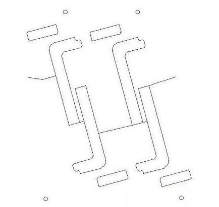 圖4為第一工序成型的模具,從膠自身離型紙(雙面離型)面模切,切到離型膜,刀痕不可太深,否則后期會(huì)發(fā)生反離型。中間加排廢刀方便把廢料從兩邊拉出。注意膠都成了孤島了,離型紙如果脫落必須采取措施,否則后一次工序會(huì)把膠拉走,造成空貼不良。
