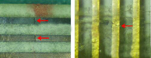 5.一旦找到確切的銅箔線路斷裂位置,如果還是無法觀察到斷裂的現(xiàn)象,就試著在顯微鏡下彎曲該位置的柔性電路板,這樣就可以突顯并放大斷裂銅箔的開口了。