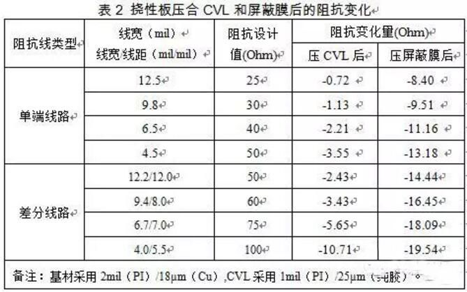 從不同流程后的線路阻抗對比上可以看出,在蝕刻后的線路上依次壓合CVL、電磁屏蔽膜后其阻抗值均呈現(xiàn)下降,如表2所示。
