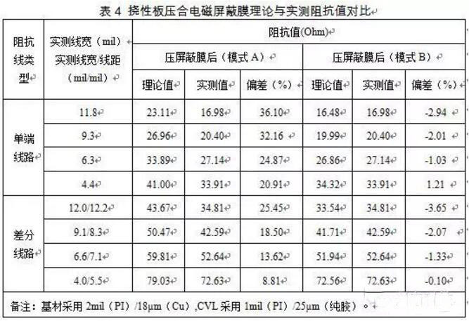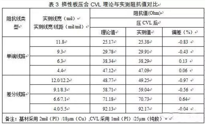 從表3可以看出,壓合CVL后的撓性板理論阻抗值與實際測量值非常接近,兩者的偏差均在1%以內(nèi)。由此可見,采用圖1中的模式A可以很好地模擬撓性板壓合CVL的理論阻抗。