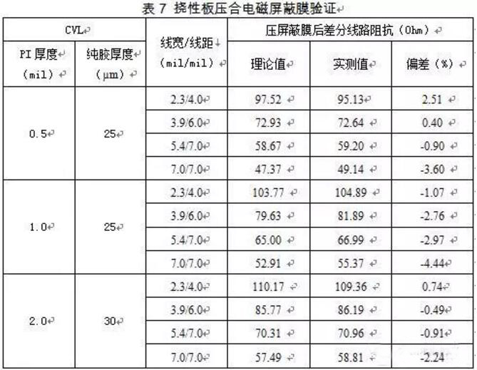 為了驗證以上分析過程中正確性,實驗采用了不同CVL的PI厚度和純膠厚度,分別測試的實際阻抗值與理論阻抗值,結(jié)果如表7所示。從表7中可以看出壓合電磁屏蔽膜的撓性板其阻抗實測值與理論值偏差均小于5 %,即通過以上的分析可以正確地預(yù)估壓合電磁屏蔽膜撓性板的理論阻抗值。