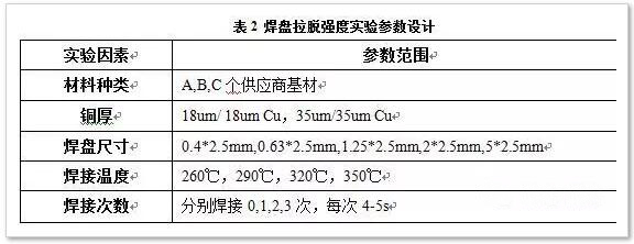 設(shè)計(jì)了材料種類,銅厚,焊盤尺寸,焊接溫度,焊接次數(shù)五個(gè)因素以綜合考察在不同條件下焊盤的拉脫強(qiáng)度。具體參數(shù)設(shè)計(jì)見(jiàn)下表。