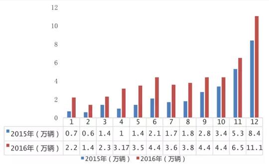 2015--2016年我國新能源汽車銷量逐漸增加(萬輛)