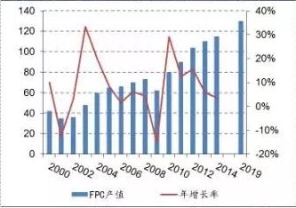當(dāng)前全球FPC 產(chǎn)業(yè)繼續(xù)向大陸轉(zhuǎn)移,中國產(chǎn)值已位居全球第一。據(jù)PrisMark數(shù)據(jù)統(tǒng)計,全球FPC 產(chǎn)值由2000年約40億美元增長至2014年的115億美元。預(yù)計2017年FPC產(chǎn)值可達128億美元,2019 年將超過130 億美元,年均增長率達3.8%。據(jù)印制電路信息統(tǒng)計,中國地區(qū)FPC 產(chǎn)值持續(xù)增長,2014 年產(chǎn)值達41.08 億美元,同比增長7.4%,占全球產(chǎn)值35.8%;預(yù)計2017年將達56.71 億美元,全球占比將提升至36%。