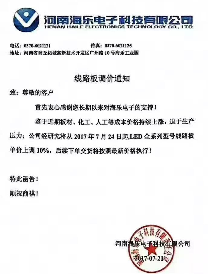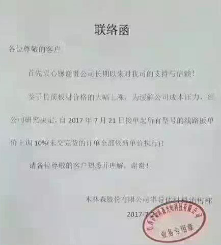 7月5日-11日,柔性線路板就有報(bào)道過(guò)山東金寶、建滔、明康、威利邦、金安國(guó)紀(jì)等數(shù)家公司先后發(fā)布銅箔、覆銅板等漲價(jià)通知,漲價(jià)行情為銅箔每噸上調(diào)1000-2000元,紙板上調(diào)10元/張,絕緣玻纖ccl上調(diào)5元/張,板料上調(diào)5元/張?,F(xiàn)在就看到有柔性線路板行業(yè)也發(fā)出漲價(jià)通知了。