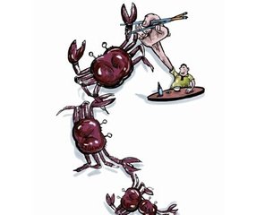 釣過螃蟹的人或許都知道,竹簍中放了一群螃蟹,不必蓋上蓋子,螃蟹是爬不出來的。因?yàn)楫?dāng)有兩只或兩只以上的螃蟹時(shí),每一只都爭(zhēng)先恐后地朝出口處爬。但簍口很窄,當(dāng)一只螃蟹爬到簍口時(shí),其余的螃蟹就會(huì)用威猛的大鉗子抓住它,最終把它拖到下層,由另一只強(qiáng)大的螃蟹踩著它向上爬。如此循環(huán)往復(fù),無一只螃蟹能夠成功“突圍”。