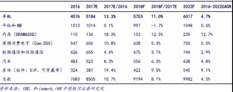 未來手機單機元器件用量上升趨勢確定,HDI 板將繼續(xù)向更薄、線寬線距更小、盲孔更微 小發(fā)展。根據(jù) Prismark 預測,內(nèi)存發(fā)展速度較快,但是手機仍然是 HDI 板增長主要動力,預 計占 HDI 板總量 60%以上,其中微孔板增速最快,2016-2022CAGR 達到 4.5%左右。