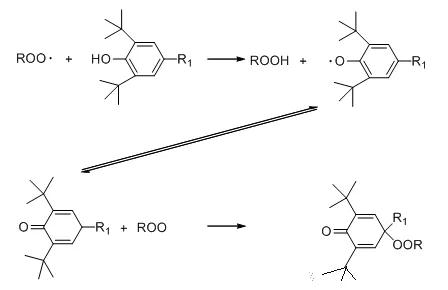 位阻酚類抗氧劑作用原理主要是捕獲活性游離基生成非活性的游離基,從而使鏈鎖反應終止,作用機理如下: