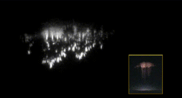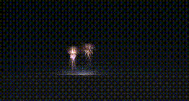 藍色噴流通常呈細錐形,從積雨云的頂端一直延伸到離地面40~50公里的電離層。藍色噴流要比精靈稀少的多,它們比紅色精靈要亮,其藍色可能是來自氮氣分子的發(fā)射光譜。