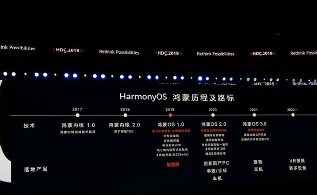 按照之前公布的計劃圖來看,鴻蒙1.0系統(tǒng)用于華為、榮耀智慧屏產(chǎn)品,2020年會有鴻蒙2.0系統(tǒng),落地產(chǎn)品包括創(chuàng)新國產(chǎn)PC、手表/手環(huán)、車機。2021年會有鴻蒙OS 3.0,主要用于音箱、耳機,2022年用于VR眼鏡等更多設備。