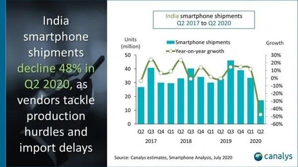 在疫情封鎖期間,印度國內(nèi)的智能手機(jī)被歸類為非必需品,甚至連亞馬遜和Flipkart等巨頭都禁止在印度分銷手機(jī)產(chǎn)品,這種僵局一直持續(xù)到5月中旬。Canalys報(bào)告數(shù)據(jù)顯示,今年第二季度,印度整體的智能手機(jī)出貨量只有1730萬臺,這比2019年第二季度的3300萬臺同比下降了48%。