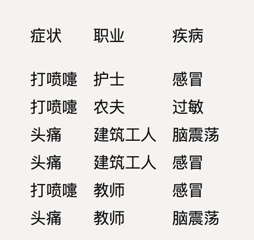 現(xiàn)在又來(lái)了第七個(gè)病人,是一個(gè)打噴嚏的建筑工人,請(qǐng)問(wèn)他患上感冒的概率有多大?