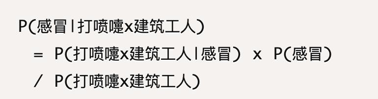 假定”打噴嚏”和”建筑工人”這兩個(gè)特征是獨(dú)立的,因此,上面的等式就變成了: