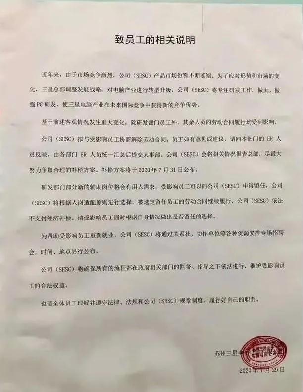 SESC(蘇州三星電子電腦的簡稱)擬與受合同影響的員工進行談判以終止勞動合同并進行賠償。若員工有任何個人意見和建議都可以向部門的相關人員報告,各部門的相關人員將集體提交給公司的人事部門。公司將向韓國總部進行意見傳達,并盡力爭取合理的薪酬補償計劃。