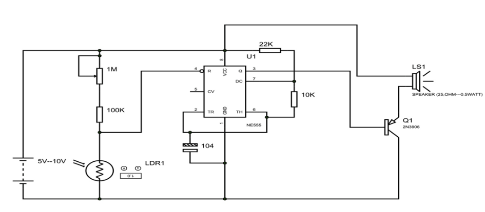 在進(jìn)一步解釋前,電路首先要處于開(kāi)啟狀態(tài),且在有光條件下蜂鳴器不會(huì)響。該狀態(tài)可以調(diào)整1MΩ的滑動(dòng)變阻器來(lái)實(shí)現(xiàn)。然后我們來(lái)看電路中的分壓網(wǎng)絡(luò),一端為1MΩ和100kΩ的電阻,一端為L(zhǎng)DR,RESET引腳連接到兩者之間。我們可以調(diào)整滑動(dòng)變阻器讓其有足夠的阻值,并在分壓網(wǎng)絡(luò)的上端造成全部電平的壓降(+5V)。這就讓分壓器的中點(diǎn)成了虛擬地(RESET引腳)??紤]到555定時(shí)器的RESET引腳為低電平觸發(fā),所以定時(shí)器會(huì)持續(xù)處于重置模式,也就不會(huì)產(chǎn)生方波。從這我們可以得出,當(dāng)有光線的情況下,555定時(shí)器為重置狀態(tài)且沒(méi)有輸出。