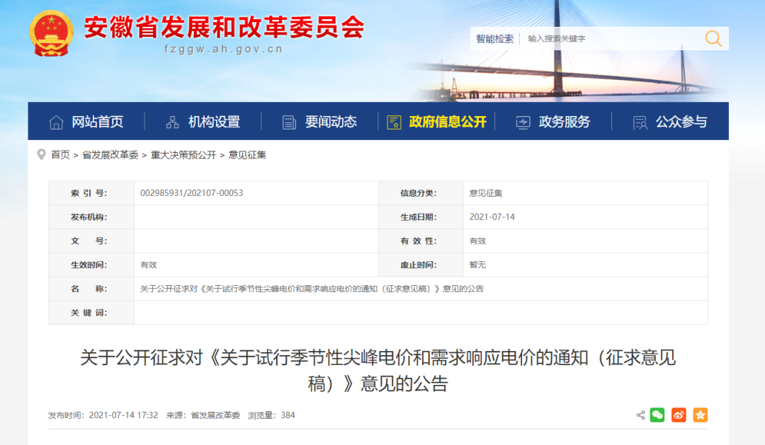 據(jù)電池FPC小編了解,7月14日,安徽省發(fā)展改革委公開了關(guān)于試行季節(jié)性尖峰用電及需求響應(yīng)電價政策的意見公告,公開征求意見。該方案實施之后,日最高氣溫超過36℃時,工商業(yè)電力用戶在高峰時段的用電價格將上漲。
