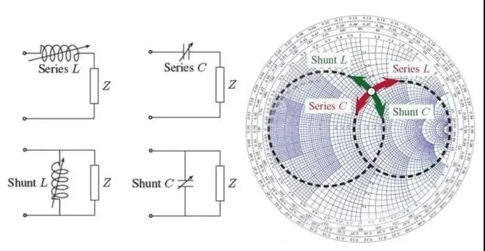 在負(fù)載之前串聯(lián)或并聯(lián)一個(gè)可變電感/電容,電路圖如下圖左側(cè)4個(gè)圖所示,將得到Smith圓圖上右側(cè)的幾條曲線。