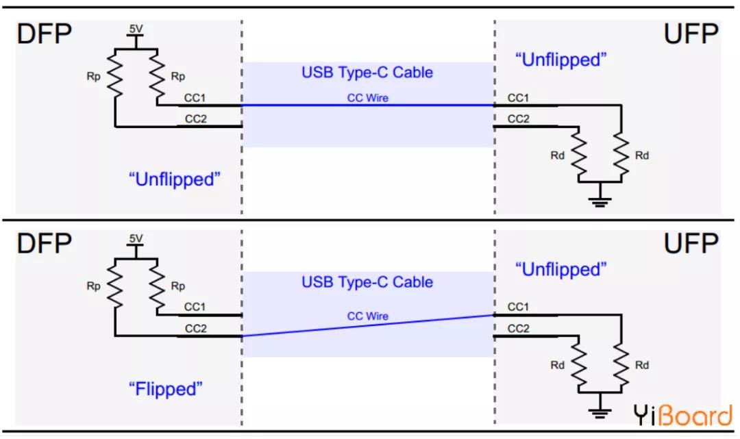 下面的圖4顯示了CC1和CC2引腳如何顯示插座/插頭方向。在此圖中,DFP代表下游面向端口,該端口充當(dāng)數(shù)據(jù)傳輸中的主機或電源。UFP表示上游面向端口,它是連接到主機或電力消費者的設(shè)備。