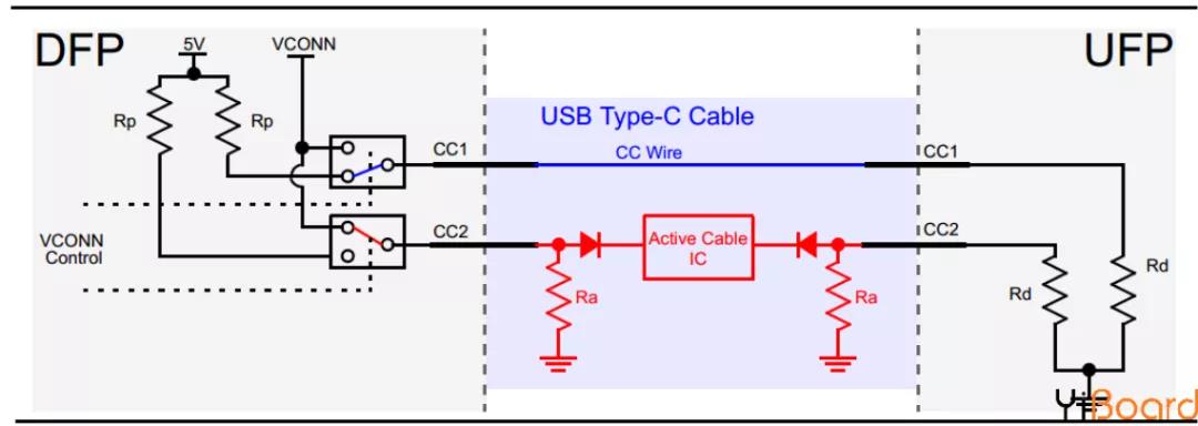 電池軟板廠小編告訴您,有源線纜使用Ra電阻來下拉CC2引腳。Ra的值與Rd不同,因此DFP仍然可以通過檢查DFP CC1和CC2引腳上的電壓來確定電纜方向。確定電纜方向后,與“有源電纜IC”對應(yīng)的通道配置引腳將連接到5 V,1 W電源,為電纜內(nèi)部的電路供電。例如,在圖5中,有效的Rp-Rd路徑對應(yīng)于CC1引腳。因此,CC2引腳連接到VCONN表示的電源。
