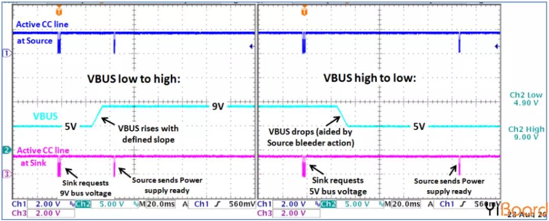如上所述,使用USB Type-C標(biāo)準的設(shè)備可以通過接口協(xié)商并選擇適當(dāng)水平的功率流。這些功率協(xié)商是通過稱為USB Power Delivery的協(xié)議實現(xiàn)的,該協(xié)議是上面討論的CC線上的單線通信。下面的圖6顯示了一個示例USB供電,其中接收器向源發(fā)送請求并根據(jù)需要調(diào)整VBUS電壓。首先,要求提供9 V總線。在源穩(wěn)定總線電壓為9 V后,它會向接收器發(fā)送“電源就緒”消息。然后,接收器請求一個5V總線,并且源提供它并再次發(fā)送“電源就緒”消息。