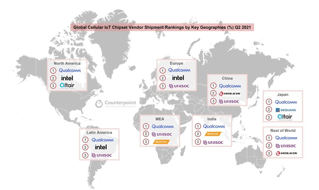 圖:2021年Q2各區(qū)域蜂窩IoT芯片供應(yīng)商出貨量排名