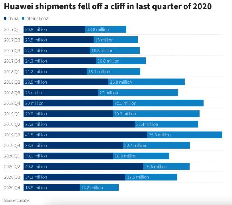 圖:華為手機(jī)的國(guó)內(nèi)/海外出貨量變化