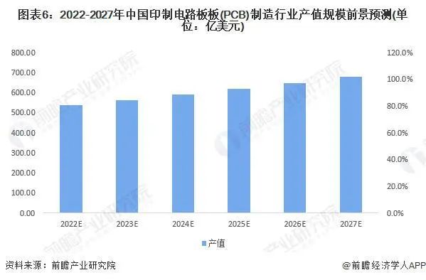 在Prismark預(yù)測(cè)基礎(chǔ)上,結(jié)合中國PCB產(chǎn)業(yè)下游主要市場(chǎng)如通信市場(chǎng)、計(jì)算機(jī)市場(chǎng)、汽車市場(chǎng)、消費(fèi)電子等行業(yè)的市場(chǎng)發(fā)展情況,前瞻預(yù)計(jì)到2027年中國PCB產(chǎn)值將達(dá)到約678億美元,2022-2027年復(fù)合增速約4.8%。