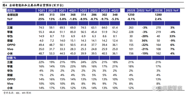 2022 年手機(jī)出貨量受全球通脹、地緣政治沖突等影響,預(yù)計(jì)同比下降 8.1%。伴隨海外通脹得到控制,消費(fèi)信心有望回暖,手機(jī)需求也有望逐步回升,23 年出貨量同比增長(zhǎng)約 2.4%。