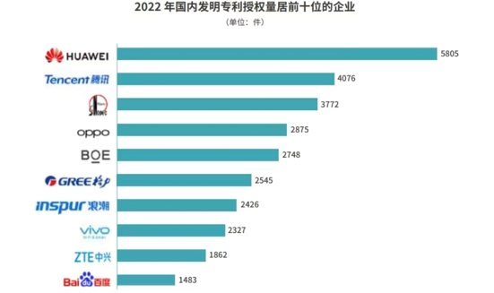 軟板廠看到,2022年國內(nèi)發(fā)明專利授權(quán)量居前十位的企業(yè),華為高居第一,為5805件,騰訊位居第二,為4076件。第三到第十位分別是中國石化、OPPO、京東方、格力、浪潮、vivo、中興、百度。