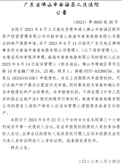 柔性線路板廠了解到,8月14日,廣東省佛山市南海區(qū)人民法院發(fā)布公告,宣布受理佛山市南海區(qū)聯(lián)華資產(chǎn)經(jīng)營(yíng)管理有限公司對(duì)南海市南美電路有限公司(簡(jiǎn)稱"南美電路")提出的破產(chǎn)清算申請(qǐng),并指定廣東天地正律師事務(wù)所為南美電路的管理人。