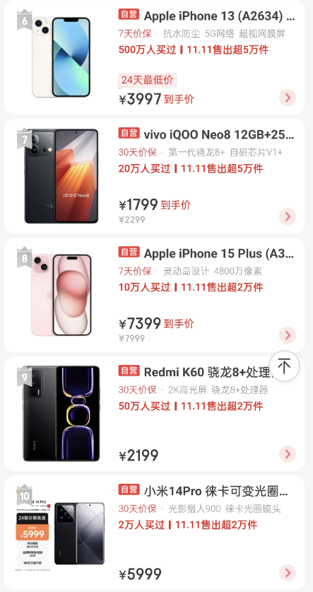 售價相對較低的中端機(jī)型iQOO Neo8和Redmi K60也獲得了2萬件以上的銷量。