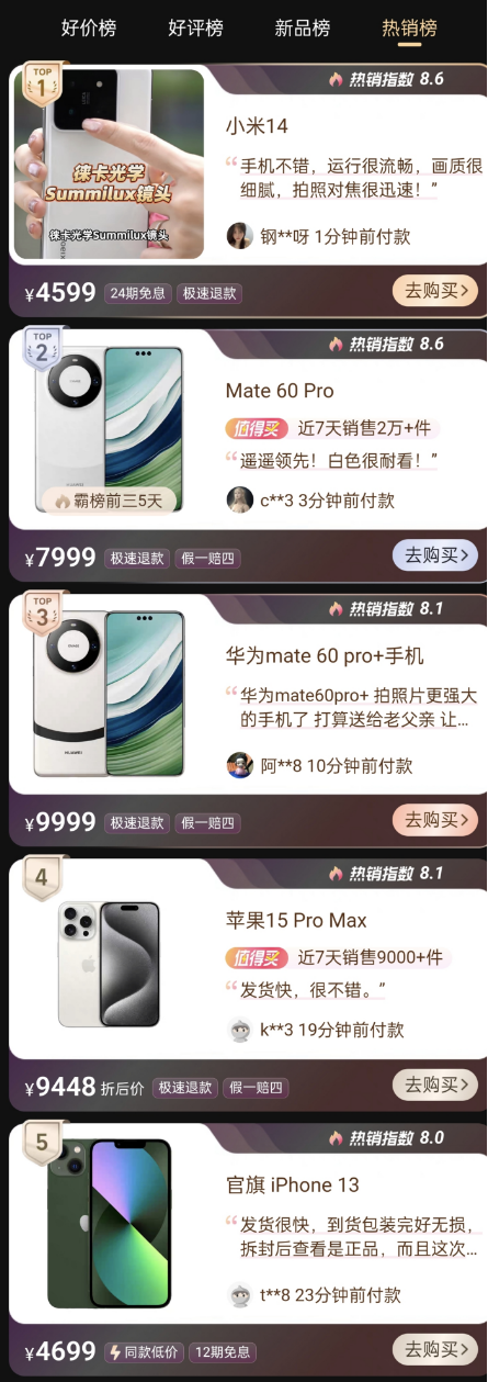 與京東平臺類似,小米14和iPhone 15 Pro Max依舊排在榜單前五。二三名分別為在今年強(qiáng)勢回歸的華為Mate 60系列機(jī)型,目前的貨量也是較為緊缺。讓小編沒想到的是,iPhone 13再次出現(xiàn),并排在第五名。