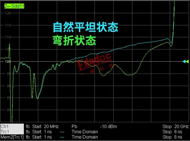 可以看到,在自然平坦的狀態(tài)下,軟板的阻抗是比較理想和線性的,但是經(jīng)過手工的彎折后,明顯看到在彎折前后的一段很長的區(qū)域內,阻抗波動很大,而且明顯阻抗是降低的,最大的降低幅度能達到10個歐姆!基本上如果1.6Gbps的高速信號在這種阻抗波動下的鏈路上傳輸,出問題的概率的確是存在的,基本上能定位到彎折情況下確實能影響高速信號的性能!