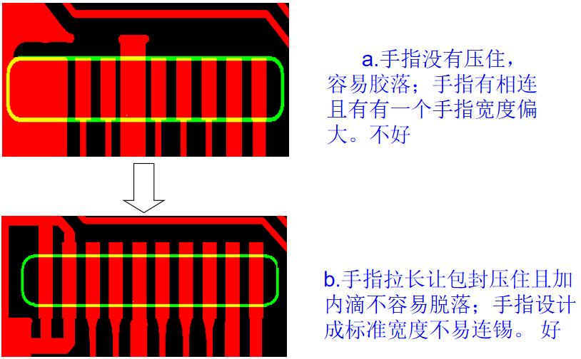 細手指端獨立手指要拉長讓包封壓住0.3mm以上,外端伸出外形0.5mm,提高手指在板上的附著力,防止在模沖時翻邊。