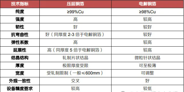 壓延銅箔是利用塑性加工原理通過對(duì)高精度銅帶(厚度通常小于150微米)反復(fù)軋制—退火而成的產(chǎn)品(厚度通常介于4-100微米,寬度通常<800毫米),其結(jié)晶形態(tài)呈片狀結(jié)構(gòu),與電解銅箔相比,具有更好的延展性、抗彎曲性和導(dǎo)電性,以及更高的強(qiáng)度,銅純度也高于電解銅箔。