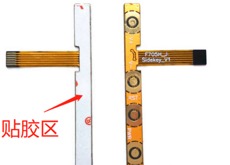 FPC軟板缺少支撐,無(wú)法直接進(jìn)行受力,一般需要依附貼在支撐面上,比如常見到的側(cè)鍵,需要貼在內(nèi)部支撐骨架上,如下圖所示,白色紙下是雙面膠,直接揭開后可以貼起來(lái)。